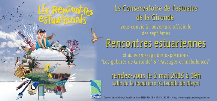 - 19h : vernissage de l’exposition Gabares de Gironde, salle de la Poudrière, suivi de l’exposition Paysages et turbulences et du lancement officiel des Rencontres estuariennes 2016, chapelle des Minimes, citadelle de Blaye.